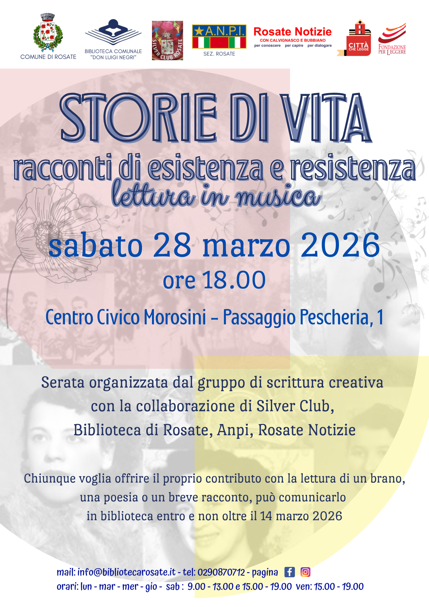 L’iniziativa è organizzata dal gruppo di scrittura creativa con la collaborazione di Silver Club Rosate, Biblioteca Comunale “Don Luigi Negri”, ANPI – Sezione di Rosate e Rosate Notizie.